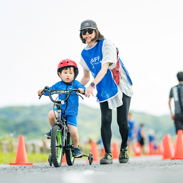 「ジュニア」「チャレンジ」は、距離が短くママチャリOK。トライアスロン完走の達成感を味わおう。